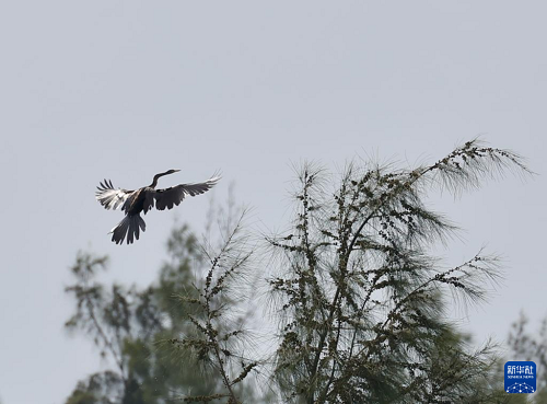 這是7月11日在海南昌江海尾國家濕地公園拍攝的黑腹蛇鵜。(新華社發(fā) 薛美麗 攝)