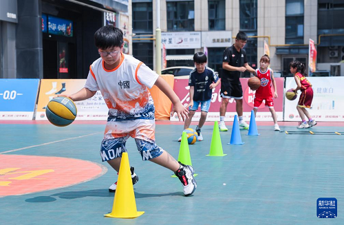 7月15日,在諸暨市悅朗新天地廣場(chǎng),籃球教練帶領(lǐng)孩子們進(jìn)行投籃、運(yùn)球等基本訓(xùn)練。(新華社記者 徐昱 攝)