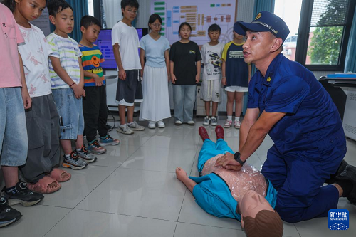 7月15日,在諸暨市安華鎮(zhèn)社會(huì)治理中心,消防隊(duì)員為孩子們講解防溺水知識(shí)和急救技能。(新華社記者 徐昱 攝)