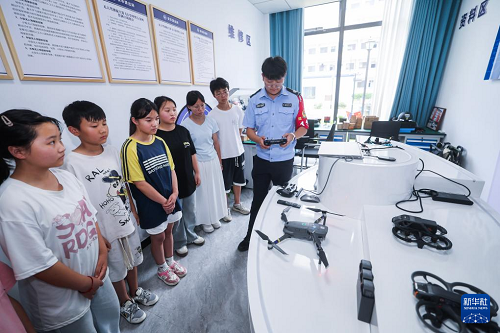 7月15日,在諸暨市安華鎮(zhèn)社會(huì)治理中心,安華鎮(zhèn)派出所輔警為孩子們講解無人機(jī)的各項(xiàng)功能。(新華社記者 徐昱 攝)