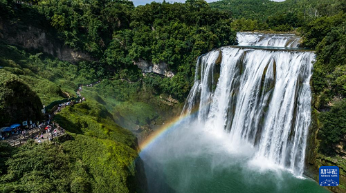 近日,位于貴州省安順市的黃果樹瀑布景區(qū)正處于夏日最佳觀賞期。黃果樹大瀑布水勢磅礴,在陽光的照射下,瀑布前架起一道彩虹,美麗的景象吸引各地游客前來觀賞游玩。