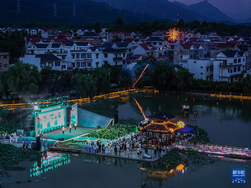 這是建德市大慈巖鎮(zhèn)的荷花節(jié)演出現(xiàn)場(chǎng)(7月17日攝,無(wú)人機(jī)照片)。(新華社記者 徐昱 攝)