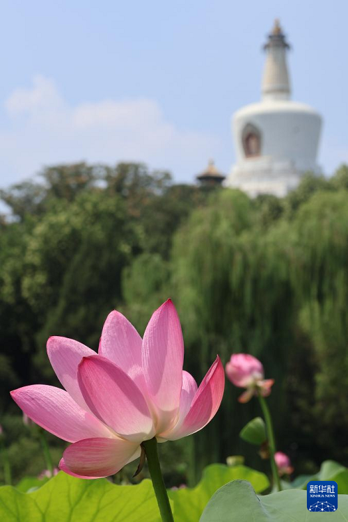 7月22日,北京北海公園盛開的荷花映襯著白塔。(新華社發(fā) 戴明軒 攝)