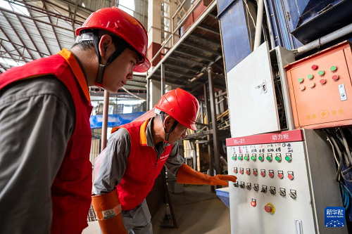 7月24日,在常德市鼎城區(qū)雙橋坪鎮(zhèn)一個水稻烘干工廠,國網(wǎng)常德供電公司電力工人在檢查烘干設(shè)備電力供應情況。(新華社記者 陳思汗 攝)