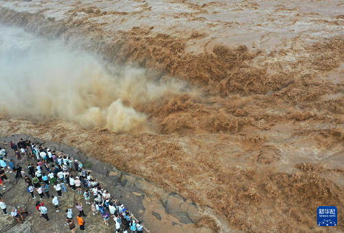 7月27日,人們在山西吉縣觀看黃河壺口瀑布(無人機照片)。(新華社發(fā) 劉宏達 攝)