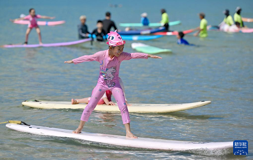 8月10日,游客在三亞市后海村附近海域沖浪。(新華社記者 郭程 攝)