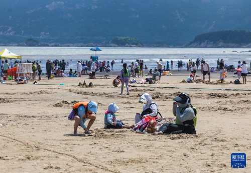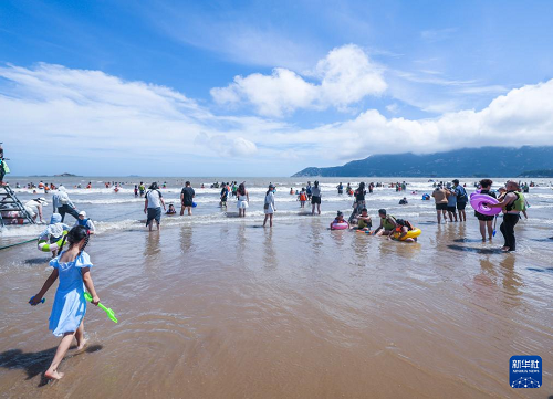 8月12日,游客在朱家尖南沙景區(qū)沙灘上游玩。(新華社記者 徐昱 攝)