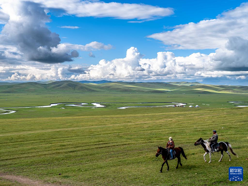 8月19日,在內(nèi)蒙古呼倫貝爾市陳巴爾虎旗,人們在莫爾格勒河畔騎馬。(新華社記者 馬金瑞 攝)