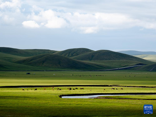 8月19日,在內(nèi)蒙古呼倫貝爾市陳巴爾虎旗,馬群在莫爾格勒河畔吃草。(新華社記者 馬金瑞 攝)