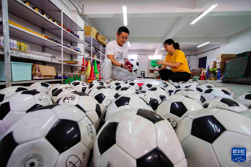8月25日,河北省遵化市第二中學(xué)體育教師在擦拭整理足球。(新華社發(fā) 劉滿倉(cāng) 攝)