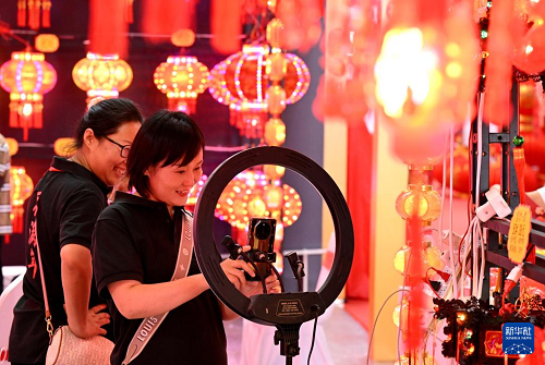 8月24日,商家在位于河北省正定縣的石家莊國際會(huì)展中心博覽會(huì)現(xiàn)場直播帶貨。(新華社發(fā) 陳其保 攝)