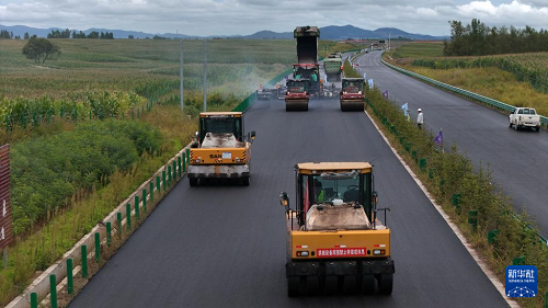 8月28日,在鐵科高速公路延壽縣至尚志界段主線,大型機械設備在進行瀝青攤鋪收尾作業(yè)(無人機照片)。(新華社記者 王松 攝)