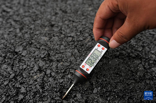 8月28日,技術人員在監(jiān)測攤鋪瀝青溫度。(新華社記者 王松 攝)