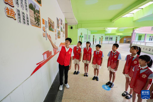 9月4日,浙江省“新時(shí)代好少年”、資深紅船小講解莫景鑠(左一)在嘉興市實(shí)驗(yàn)小學(xué)給新一批紅船小講解員傳授自己的講解經(jīng)歷和經(jīng)驗(yàn),同時(shí)也介紹了學(xué)校紅船小講解的歷史由來。(新華社記者 徐昱 攝)