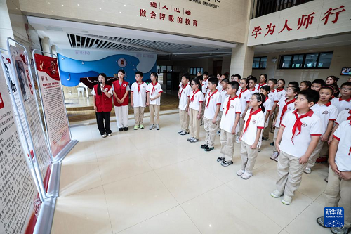 9月4日,北京師范大學(xué)南湖附屬學(xué)校的老師在給學(xué)生們講解“致敬禾城鐵血·同輝國(guó)旗榮光”——嘉興市新四軍老戰(zhàn)士抗戰(zhàn)英勇事跡圖版巡展的英雄事跡。(新華社記者 徐昱 攝)