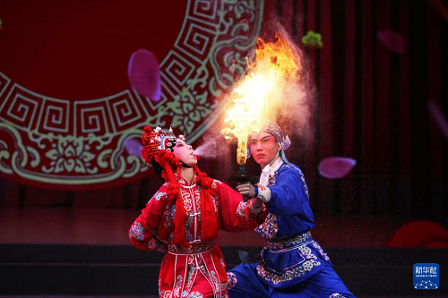 9月13日晚,在定西市隴中許鐵堂秦腔劇院,演員表演秦腔絕活“吹火”。(新華社發(fā) 王克賢 攝)
