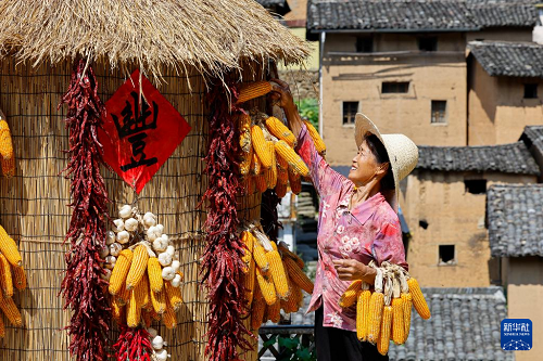 9月17日,安徽黃山歙縣陽產(chǎn)村村民在土樓前晾曬農(nóng)作物。(新華社發(fā) 施亞磊 攝)