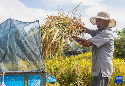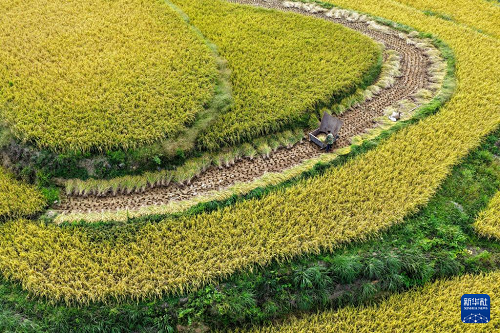 地處武陵山區(qū)腹地的重慶市黔江區(qū)五里鎮(zhèn)水稻種植面積5300畝,是武陵山地區(qū)糧食主要產(chǎn)區(qū)之一。秋收時節(jié),金黃色的水稻鋪滿山坡,稻農(nóng)們利用晴好天氣搶收稻谷,呈現(xiàn)出一派美麗的豐收畫卷。