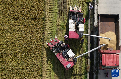 10月10日,湖北省宜昌市秭歸縣沙鎮(zhèn)溪鎮(zhèn)長春村村民駕駛農(nóng)機(jī)在田間收獲水稻(無人機(jī)照片)。(新華社發(fā) 雷勇 攝)