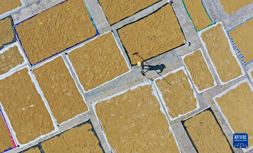 10月10日,浙江省臺州市仙居縣官路鎮(zhèn)增仁村農(nóng)民在晾曬稻谷(無人機(jī)照片)。(新華社發(fā) 王華斌 攝)