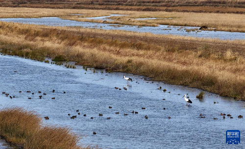 10月14日在黑龍江省同江市三江口國(guó)家濕地公園拍攝的東方白鸛和野鴨(無人機(jī)照片)。(新華社發(fā) 劉萬平 攝)