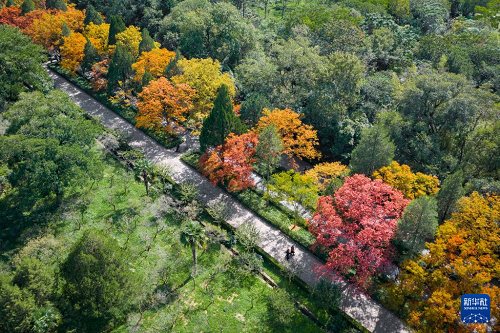 10月23日,游客在江蘇南京明孝陵景區(qū)石象路觀賞秋景(無人機照片)。(新華社發(fā) 蘇陽 攝)