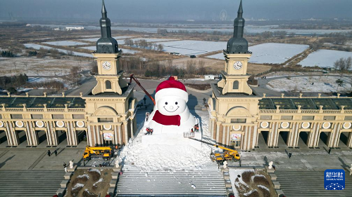 12月14日拍攝的建設中的哈爾濱市群力音樂公園網(wǎng)紅大雪人(無人機照片)。(新華社發(fā) 劉洋 攝)