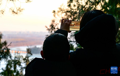 12月21日,游客在頤和園萬(wàn)壽山上拍攝十七孔橋“金光穿洞”美景。(新華社記者 陳曄華 攝)