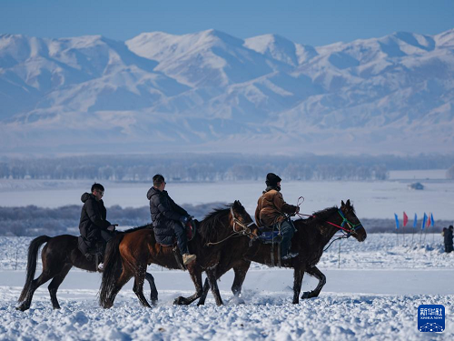 1月3日,在新疆昭蘇濕地公園,游客在當?shù)啬撩瘢ㄓ遥ьI下體驗雪地騎馬。(新華社記者 胡虎虎 攝)
