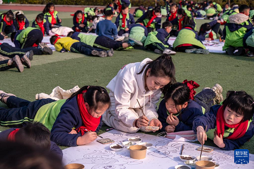 1月14日,四川省自貢市榮縣樹人小學(xué)校操場上,千余名師生共同在巨型“馬”字輪廓的畫布上創(chuàng)作,以紙繪、陶板繪等形式畫出各式生肖馬。