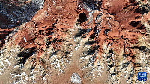 紅崖臺(tái)地位于內(nèi)蒙古烏蘭察布市四子王旗北部,是內(nèi)蒙古四子王國(guó)家地質(zhì)公園的重要組成部分。這里山丘聳立、溝壑縱橫,山體呈現(xiàn)赤紅色。隆冬時(shí)節(jié),稀薄殘雪點(diǎn)綴其間,在蒼茫天地中勾勒出一幅靜謐而壯麗的自然畫(huà)卷。