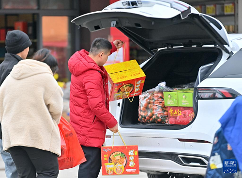 2月11日,在柳州市柳南區(qū)瑞龍路一家農(nóng)產(chǎn)品批發(fā)市場,市民將年貨搬上車。(新華社記者 黃孝邦 攝)