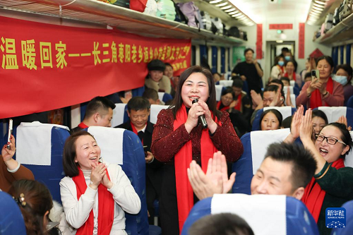2月11日,棗陽籍務工人員在K1127次列車上自編自演節(jié)目。(新華社記者 王翔 攝)
