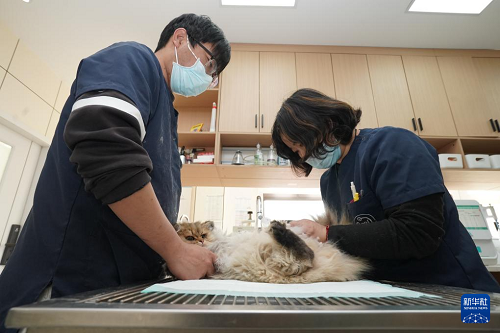 2月3日,在無錫關(guān)愛寵物醫(yī)院,醫(yī)護人員給寵物貓?zhí)昝#ㄐ氯A社發(fā) 劉臻睿 攝)