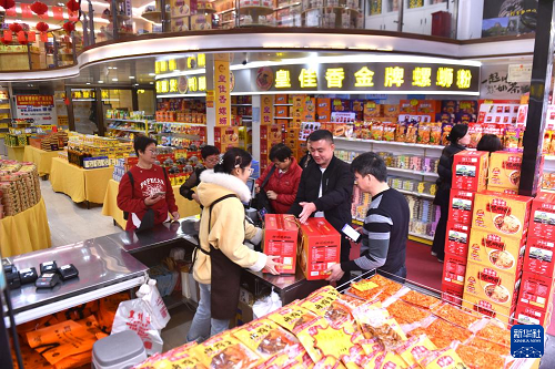 在廣西柳州市青云民生市場一家特產(chǎn)超市,游客在選購螺螄粉(2026年3月10日攝)。(新華社記者 黃孝邦 攝)