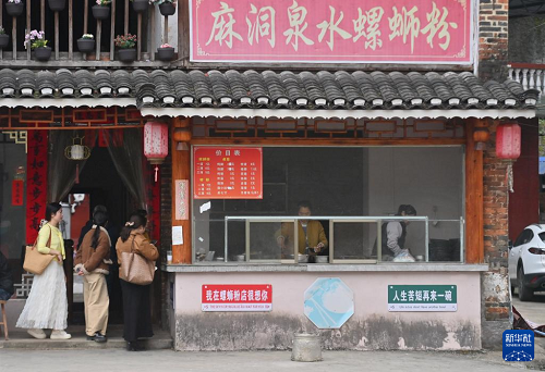 游客在廣西融水苗族自治縣融水鎮(zhèn)新國村一家螺螄粉店排隊購買螺螄粉(2026年3月7日攝)。(新華社記者 黃孝邦 攝)