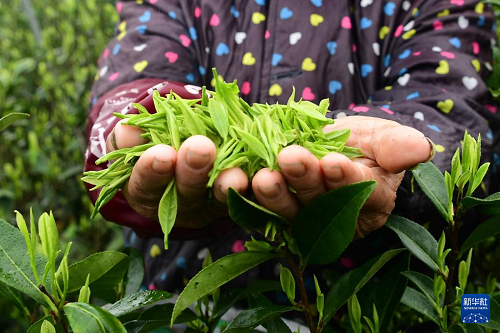 3月28日,在廣西河池市羅城仫佬族自治縣兼愛鄉(xiāng)大竹村白茶基地,采茶工展示采摘的明前茶芽。(新華社發(fā) 廖光福 攝)