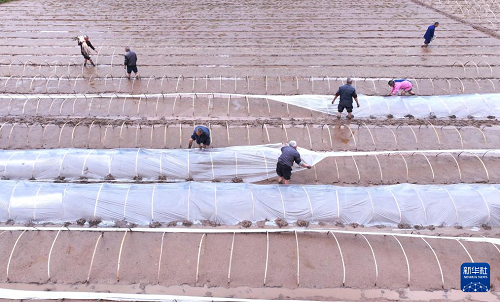 3月31日,村民在四川省眉山市仁壽縣板橋鎮(zhèn)青龍社區(qū)進(jìn)行水稻集中育秧(無人機(jī)照片)。(新華社發(fā) 潘建勇 攝)