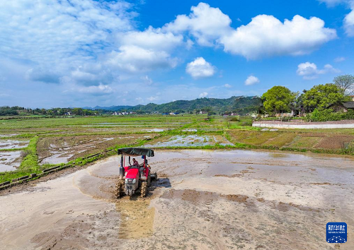 4月1日,湖南省常寧市蘭江鄉(xiāng)景星村,農(nóng)機手駕駛農(nóng)機翻耕農(nóng)田,準備機插早稻秧苗(無人機照片)。(新華社發(fā) 周秀魚春 攝)