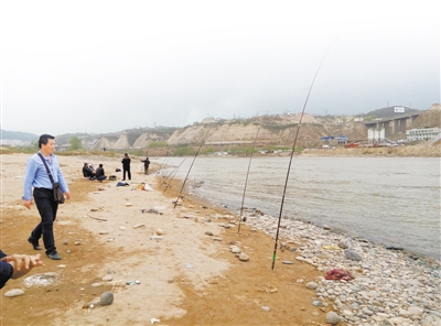 十幾個(gè)釣魚竿整齊地排在河邊。蘭州晨報(bào)記者 房毅 攝