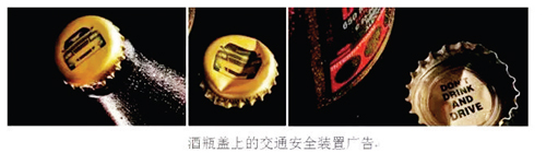 美國將警示語作為酒品包裝的強制性標注內(nèi)容,要求飲料,酒的品牌標簽、獨立的前標簽或者背標簽、側(cè)標簽都應(yīng)獨立,并有別于標簽中其他信息地標示:“政府警示,根據(jù)普通外科醫(yī)生建議,孕婦不應(yīng)該飲酒,以防止新生兒缺陷,飲酒會減弱個人駕駛車或操控機械的能力并可能引發(fā)健康問題?!贝送?國外的產(chǎn)品包裝設(shè)計上也植入了公益理念。如上圖廣告可對飲酒人群針對性的進行廣告宣傳,采用打開酒瓶蓋必須以破壞“車輛”為代價的形式,傳達喝酒不能開車的安全理念。
