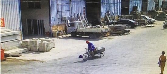 直到上午8點50分左右,一名騎著三輪車的男子經(jīng)過這里,下車查看后把包撿走了?!八┲{色的工作服,戴著個紅色的安全帽,把包打開看了下,然后就撿起來放到了車上?!?/p>