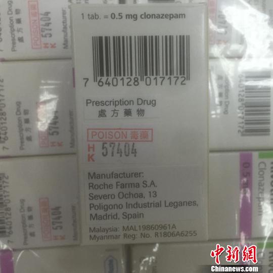 經(jīng)查驗(yàn)發(fā)現(xiàn),背包內(nèi)放置著23盒嶄新的藥物,共計1.4千克。這些藥物分四排用透明塑料紙纏繞,每個盒子內(nèi)裝有一個塑料藥瓶,內(nèi)有50片藥丸。藥盒上及內(nèi)部的說明書均為外文印刷。在最外面包裝上,貼著用中文繁體字印刷的“毒藥”和“處方藥物”字樣。關(guān)員立刻查閱了藥品說明,發(fā)現(xiàn)這些藥物居然是被稱為“最強(qiáng)安眠藥”的氯硝西泮。