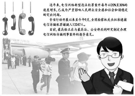 《法制日?qǐng)?bào)》記者從最高人民檢察院與公安部近日聯(lián)合召開的電信網(wǎng)絡(luò)新型違法犯罪重點(diǎn)整治、突出地區(qū)督導(dǎo)會(huì)上了解到,被掛牌的7個(gè)重點(diǎn)地區(qū)和5個(gè)突出地區(qū)檢察機(jī)關(guān)積極主動(dòng)作為,出重拳、下重手、用重典,快速批捕起訴了一批有震動(dòng)、有影響的重大電信網(wǎng)絡(luò)詐騙犯罪案件,取得了初步成效。據(jù)統(tǒng)計(jì),專項(xiàng)行動(dòng)開展以來至今年9月,全國檢察機(jī)關(guān)共批準(zhǔn)逮捕電信詐騙犯罪嫌疑人13247人。