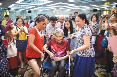 2016年7月9日,重慶雙百歲老人夫妻過(guò)生日,子女們特意為他們?cè)诮夥疟宥季频昱e辦了一場(chǎng)雙百盛典。圖/視覺(jué)中國(guó)