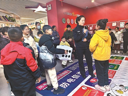 反詐中心民警張曉婉把自制的“反詐飛行棋”鋪在地面。孩子們見有游戲玩,迅速圍了上來。