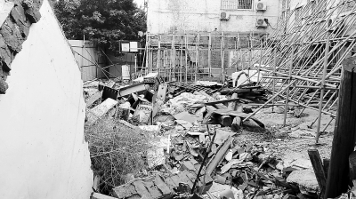 一節(jié)節(jié)鋼梁和木樁橫七豎八地堆在廢墟上,舊衣破被散落一地,已與凌亂的碎磚瓦一樣顏色,枯黃的蒿草更透著一股凄涼。幾十上百根黃色的鋼管密密匝匝地交織著,在僅有的堅固地面落腳,努力頂住93號院南側和西側的4層白色樓體。
