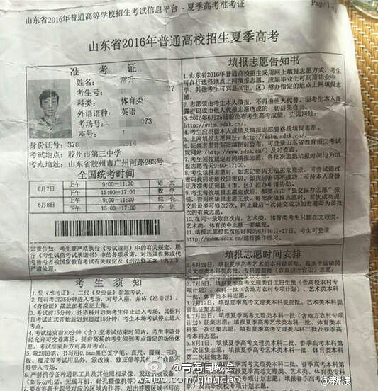 “如果不是他收到了通知書,我永遠也不會知道這個秘密。”常升告訴記者,他口中的“他”是室友兼摯友郭某。常升和郭某都是體育特長生,兩人今年高考成績相仿,在填報志愿的當天,先后用體育老師遲老師的電腦填報了志愿,均為陜西師范大學的免費師范生。但是錄取通知一下,常升傻了眼,自己并沒有被錄取,但是比自己分數(shù)更低的郭某卻收到了錄取通知書,而且陜西師范大學在山東招收的免費師范生還沒有招滿,種種情況讓常升十分不理解。圖為常升高考相關信息。