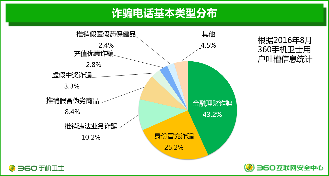 9月7日,360在京發(fā)布了國內(nèi)首份基于大數(shù)據(jù)研究的電信詐騙分析報(bào)告——《2016中國電信詐騙形勢分析報(bào)告》。報(bào)告中顯示,在用戶接到的所有詐騙電話中,虛假的金融理財(cái)詐騙最多,占43.2%,此類詐騙在北上廣深等大城市尤其盛行。其次是身份冒充詐騙,占25.2%。各類虛假的業(yè)務(wù)推銷電話也是被用戶大量吐槽的詐騙電話類型。