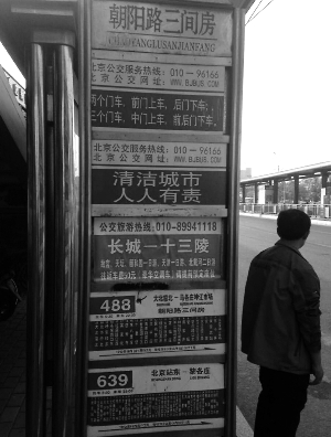 5日,記者來(lái)到朝陽(yáng)區(qū)三間房公交車(chē)站,見(jiàn)站牌上除了488路、639路站牌和兩塊公益提示牌外,中間出現(xiàn)了一塊顯示著“公交旅游熱線(xiàn),長(zhǎng)城——十三陵”的牌子,牌子下方還有一排小字,寫(xiě)著北京一些著名景點(diǎn)的一日游,往返車(chē)費(fèi)50元。記者注意到,不同于其他站牌,這塊公交旅游熱線(xiàn)為不干膠質(zhì)地,表面嶄新干凈,明顯剛粘貼上不久,而正規(guī)公交站牌則是不銹鋼的鋼板。
